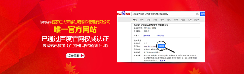 隨著產品的升級,大宋醉仙鴨總部的經營理念不斷提升,經營的規(guī)模不斷擴大,之后又陸續(xù)開了多家直營店。2014年3月,石家莊大宋醉仙鴨餐飲管理有限公司正式成立,之后在國家商標總局申請注冊“大宋醉仙鴨”商標。